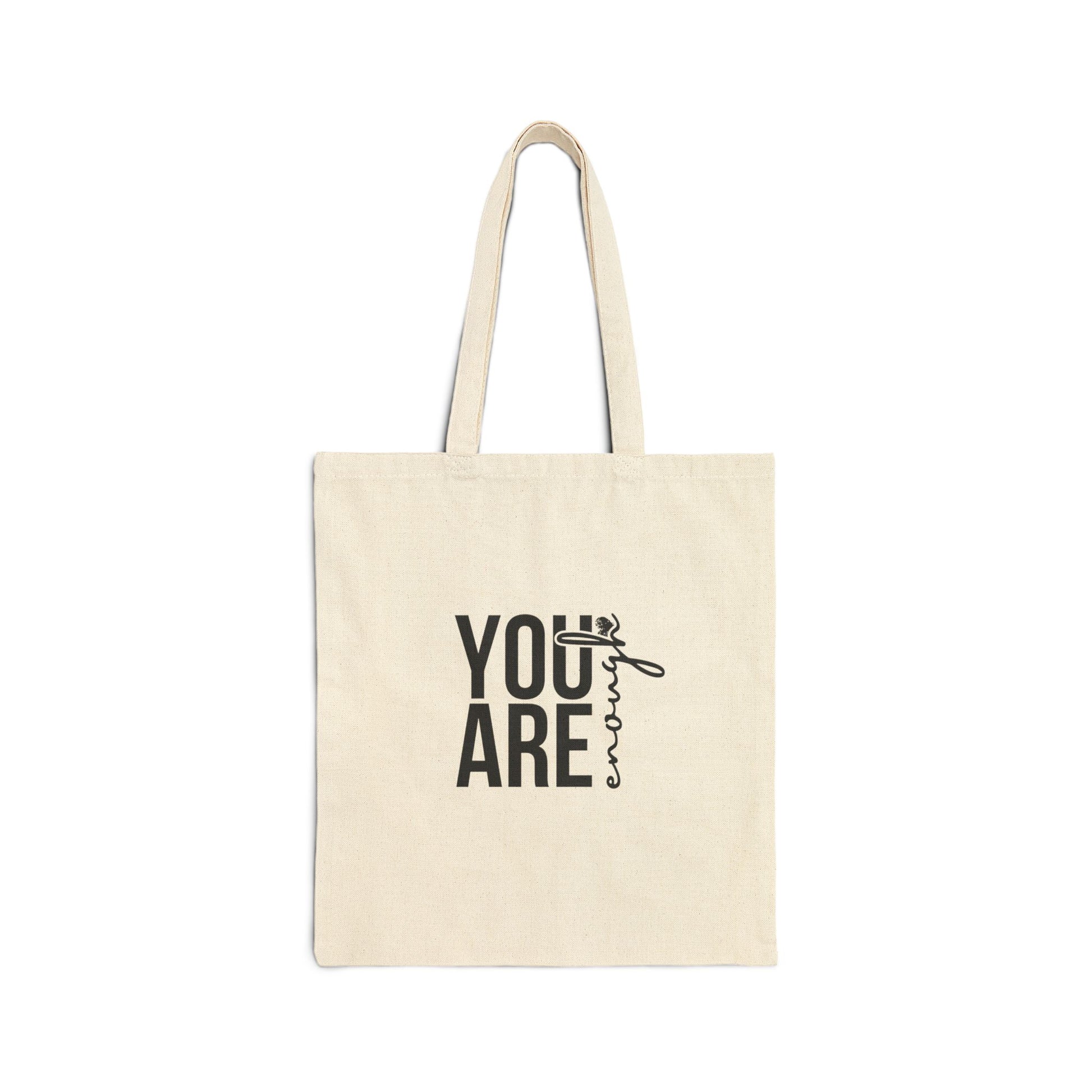 A sturdy and stylish tote bag with the message 'You are enough' printed on it. Perfect for daily use and carrying your essentials with a positive reminder. Ideal for individuals looking for a functional and uplifting accessory in their everyday life. Relevant for self-love, mental health awareness, and positivity celebrations.